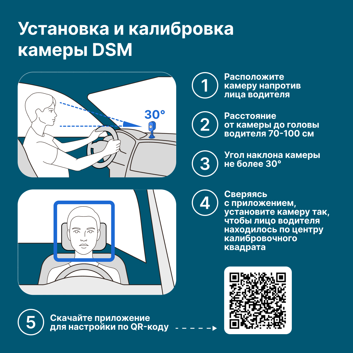 Для настройки камеры DSM для водителя в приложении предусмотрена квадратная разметка. Лицо человека должно находиться в центре рамки, но не прижиматься к краям для предотвращения ложных тревог. В процессе калибровки программный алгоритм «запоминает» положение глаз и другие черты лица водителя в нормальном состоянии.