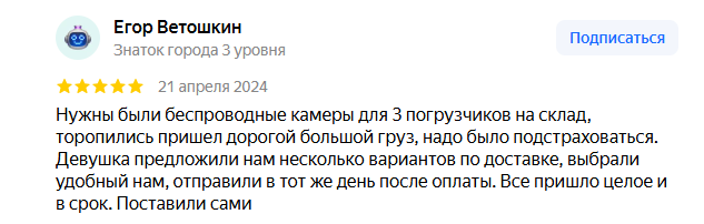 Нужны были беспроводные камеры для 3 погрузчиков на склад, торопились пришел дорогой большой груз, надо было подстраховаться. Девушка предложили нам несколько вариантов по доставке, выбрали удобный нам, отправили в тот же день после оплаты. Все пришло целое и в срок. Поставили сами скрыть