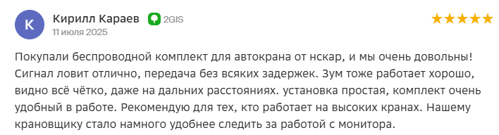 Покупали беспроводной комплект для автокрана от нскар, и мы очень довольны! Сигнал ловит отлично, передача без всяких задержек. Зум тоже работает хорошо, видно всё чётко, даже на дальних расстояниях. установка простая, комплект очень удобный в работе. Рекомендую для тех, кто работает на высоких кранах. Нашему крановщику стало намного удобнее следить за работой с монитора. скрыть