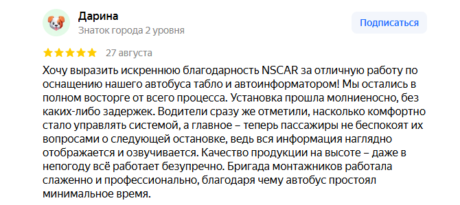Хочу выразить искреннюю благодарность NSCAR за отличную работу по оснащению нашего автобуса табло и автоинформатором! Мы остались в полном восторге от всего процесса. Установка прошла молниеносно, без каких-либо задержек. Водители сразу же отметили, насколько комфортно стало управлять системой, а главное – теперь пассажиры не беспокоят их вопросами о следующей остановке, ведь вся информация наглядно отображается и озвучивается. Качество продукции на высоте – даже в непогоду всё работает безупречно. Бригада монтажников работала слаженно и профессионально, благодаря чему автобус простоял минимальное время.
