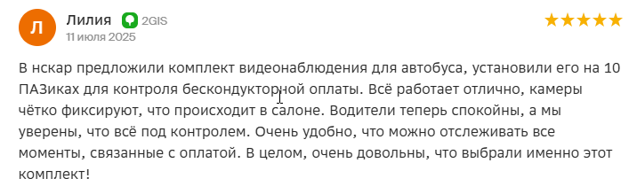 В нскар предложили комплект видеонаблюдения для автобуса, установили его на 10 ПАЗиках для контроля бескондукторной оплаты. Всё работает отлично, камеры чётко фиксируют, что происходит в салоне. Водители теперь спокойны, а мы уверены, что всё под контролем. Очень удобно, что можно отслеживать все моменты, связанные с оплатой. В целом, очень довольны, что выбрали именно этот комплект!