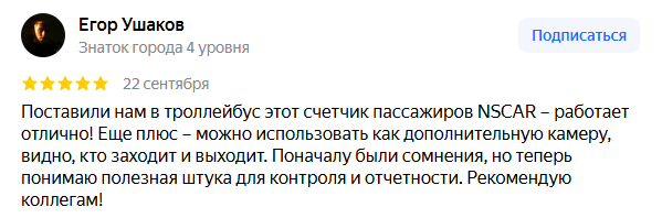 Поставили нам в троллейбус этот счетчик пассажиров NSCAR – работает отлично! Еще плюс – можно использовать как дополнительную камеру, видно, кто заходит и выходит. Поначалу были сомнения, но теперь понимаю полезная штука для контроля и отчетности. Рекомендую коллегам!