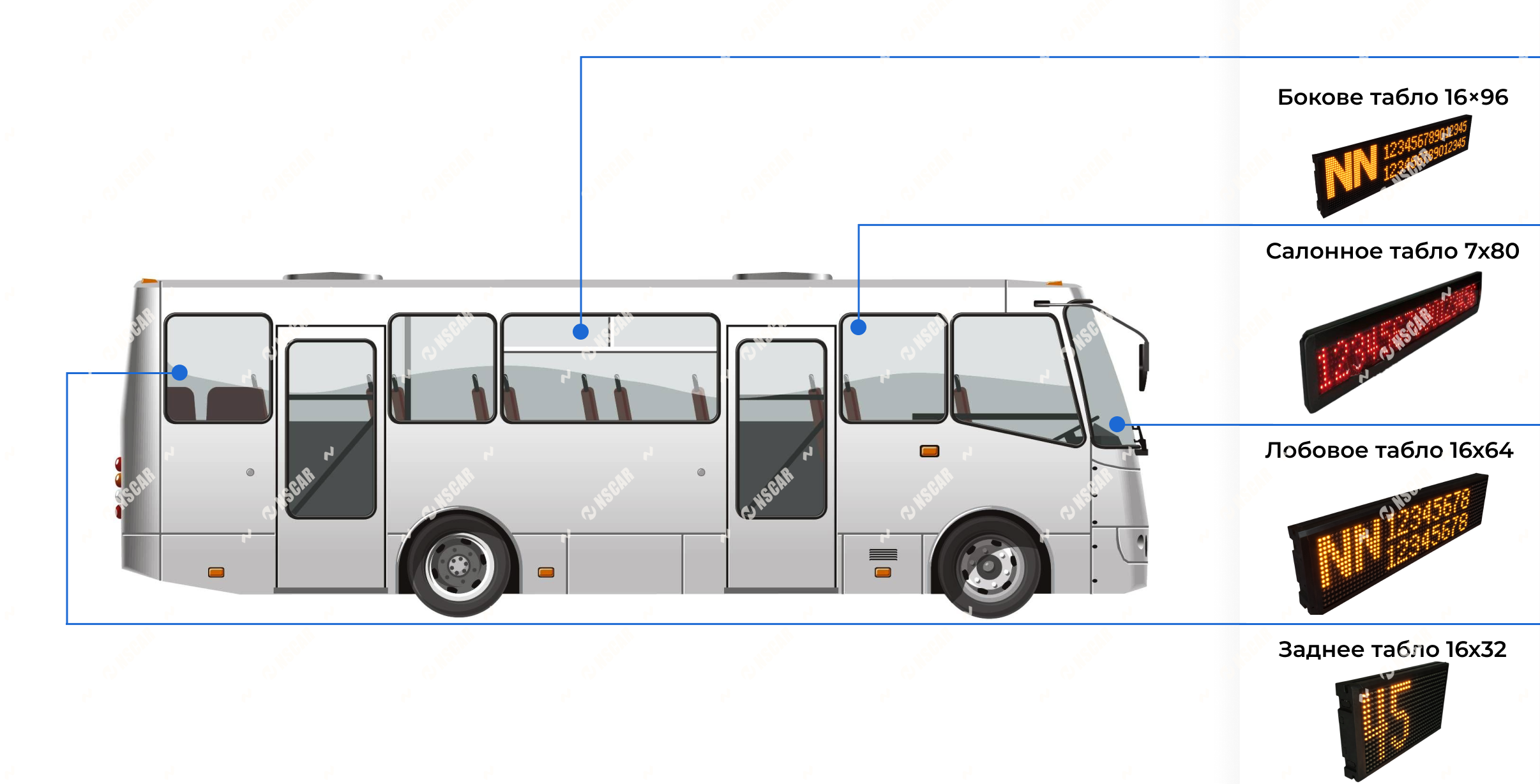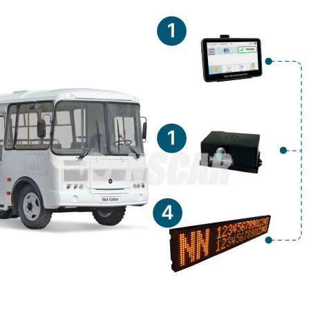 Комплект LED-табло для автобуса с автоинформатором NSCAR - готовое решение для визуального и звукового информирования пассажиров в городском и междугороднем транспорте. В состав комплекта входят 4 LED-табло (лобовое, боковое, салонное и заднее), автоинформатор, усилитель звука и динамик, что позволяет организовать полноценную систему отображения маршрута и озвучивания остановок.