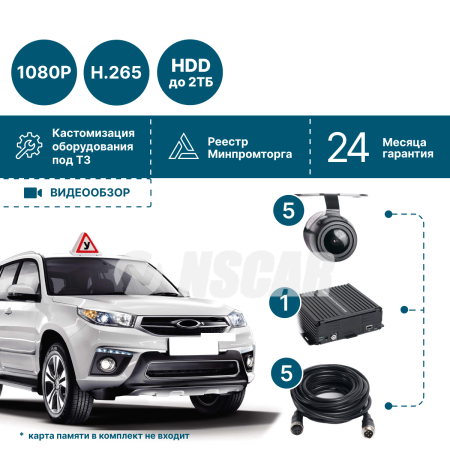 Комплект NSCAR 501 FullHD включает в себя 5 камер FullHD и одновременно записывает живое видео с них. Видеозапись ведется с частотой 25 к/c на каждый канал.