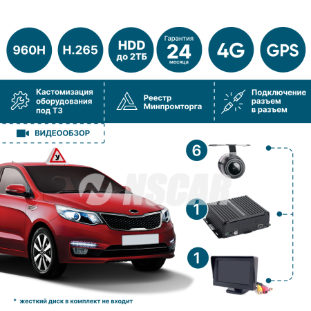 Комплект видеонаблюдения NSCAR для автошкол 804 HDD+SD разработан для организации современного контроля учебного транспорта и полностью соответствует требованиям ГИБДД. В основе комплекта используется автомобильный видеорегистратор NSCAR 801HD SD+HDD с поддержкой 4G и GPS/ГЛОНАСС, обеспечивающий не только локальную запись, но и удалённый доступ к системе.