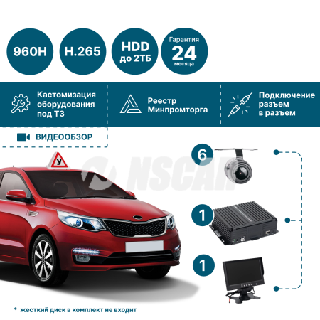 Комплект видеонаблюдения NSCAR для автошкол 802 HDD+SD соответствует всем требованиям ГИБДД. В состав комплекта входит 7-дюймовый монитор и видеорегистратор с полным набором оборудования, необходимого для подключения и стабильной эксплуатации системы.
