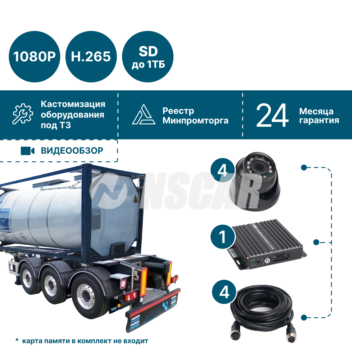 Комплект видеонаблюдения NSCAR на 4 камеры для топливозаправщика BN401 FullHD_SD подходит для установки на бензовозы, топливозаправщики, химические автоцистерны, танк-контейнеры, железнодорожные цистерны, битумовозы, бортовые автомобили, тентованные автомобили, изотермические автомобили (фургоны, рефрижераторы, прицепы)