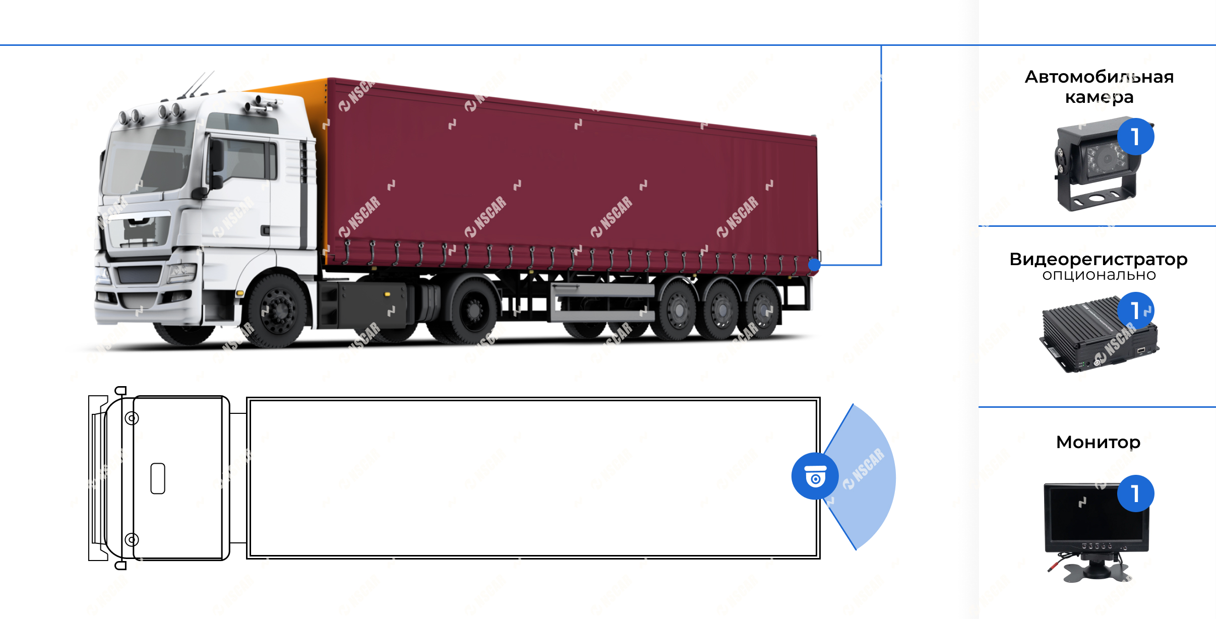 Беспроводной Full HD комплект видеонаблюдения (камера монитор 7'') NSCAR PK101 подходит для установки на малотоннажные грузовики, газели, фургоны, прицепы и полуприцепы, тягачи, фуры, самосвалы, тралы, грузовые бортовые автомобили, кран-манипуляторы, скотовозы, зерновозы, кормовозы, контейнеровозы, цистерны, ломовозы, автовозы, лесовозы, панелевозы.