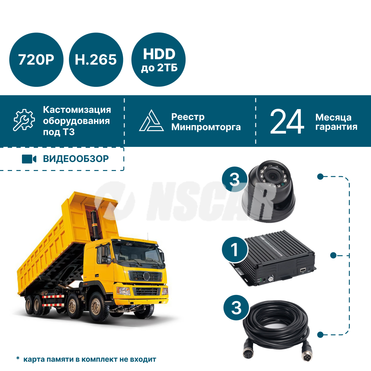Комплект видеонаблюдения NSCAR (3 видеокамеры) для самосвала GT301_HDD (запись на HDD) подходит для установки на самосвалы, грузовики, грузовые бортовые автомобили, скотовозы, зерновозы, кормовозы, контейнеровозы. Комплект подходит для установки на карьерные самосвалы (БелАЗ, Komatsu, Caterpillar, Hitachi, CAT и др).
