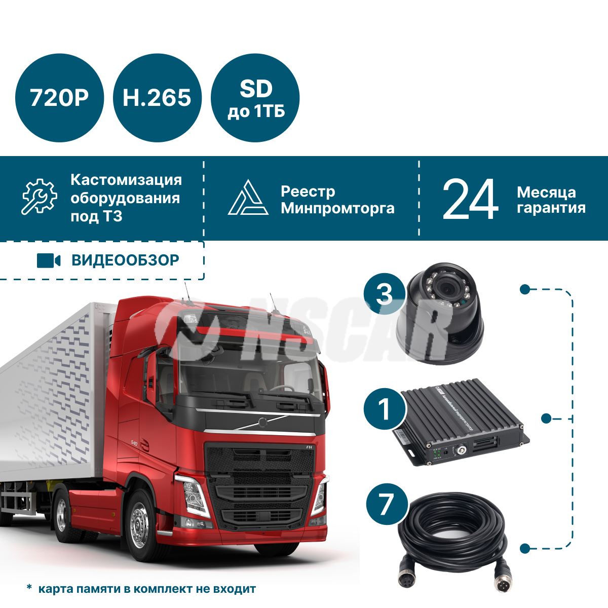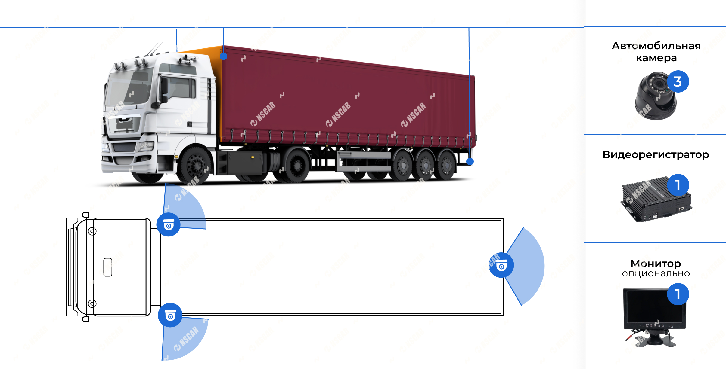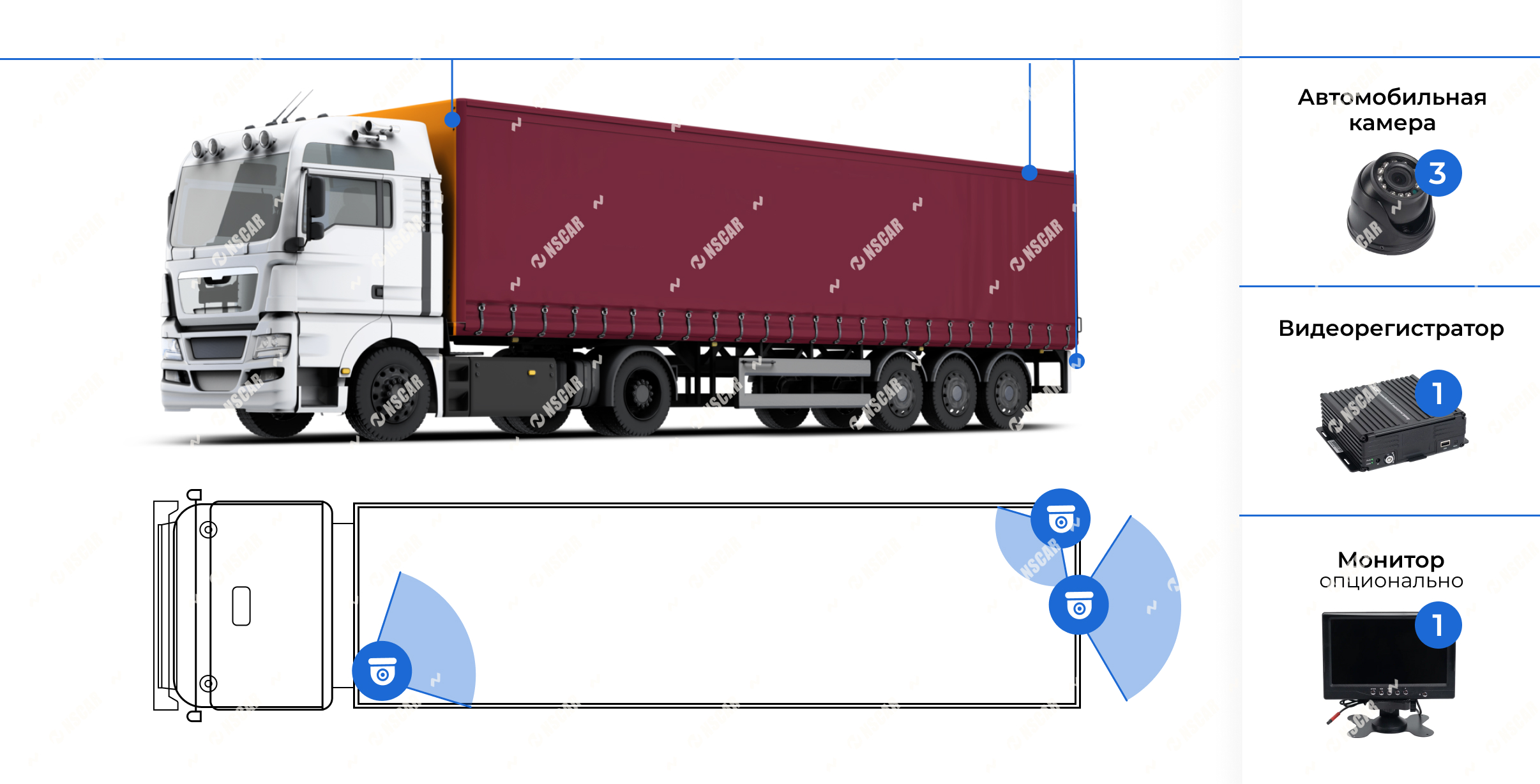 Специализированный комплект видеонаблюдения для седельного тягача NSCAR разработан грузовых фур дальнего следования. Система включает 3 камеры высокого разрешения, обеспечивающие полный контроль за дорожной обстановкой и грузом. А также комплект кабелей для тягача и полуприцепа на 3 камеры, для возможности подключения камер на прицепы, прицепные вагоны, за счет гибкого витого наружного переходника.
