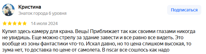В кабину крана можно установить видеокамеру NSCAR FD317 ver.06. Для монтажа на каретку или оголовок стрелы используется камера NSCAR FD317 ver.10. Подключить оборудование на стреле можно к осветительным приборам или выведенному питанию. Передача сигнала от камеры к монитору осуществляется с помощью беспроводного передатчика видео сигнала. Дальность приема до 200 м.