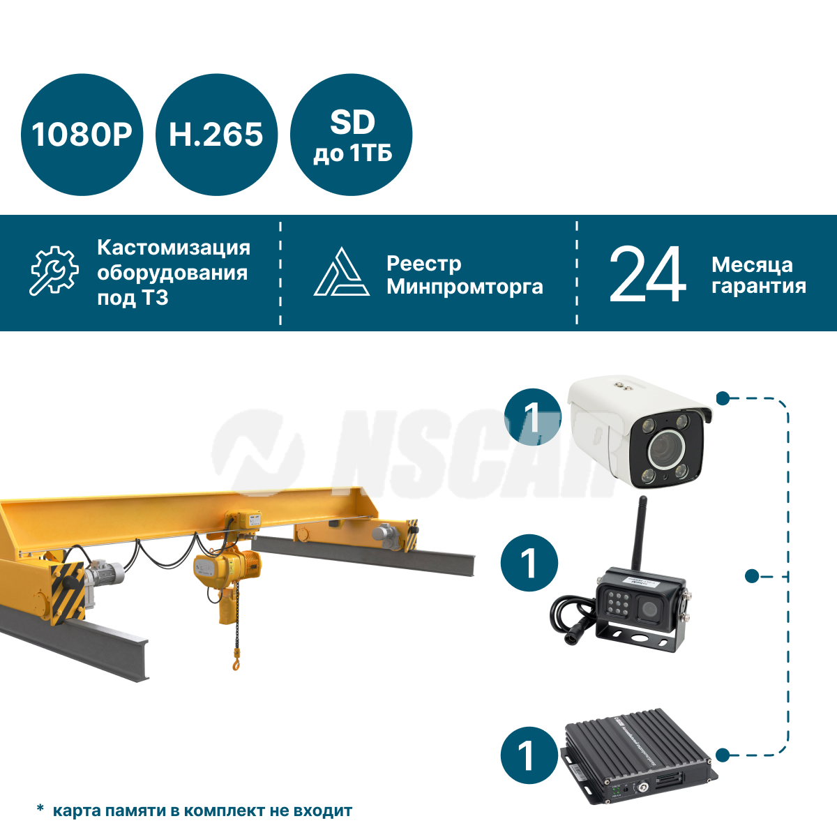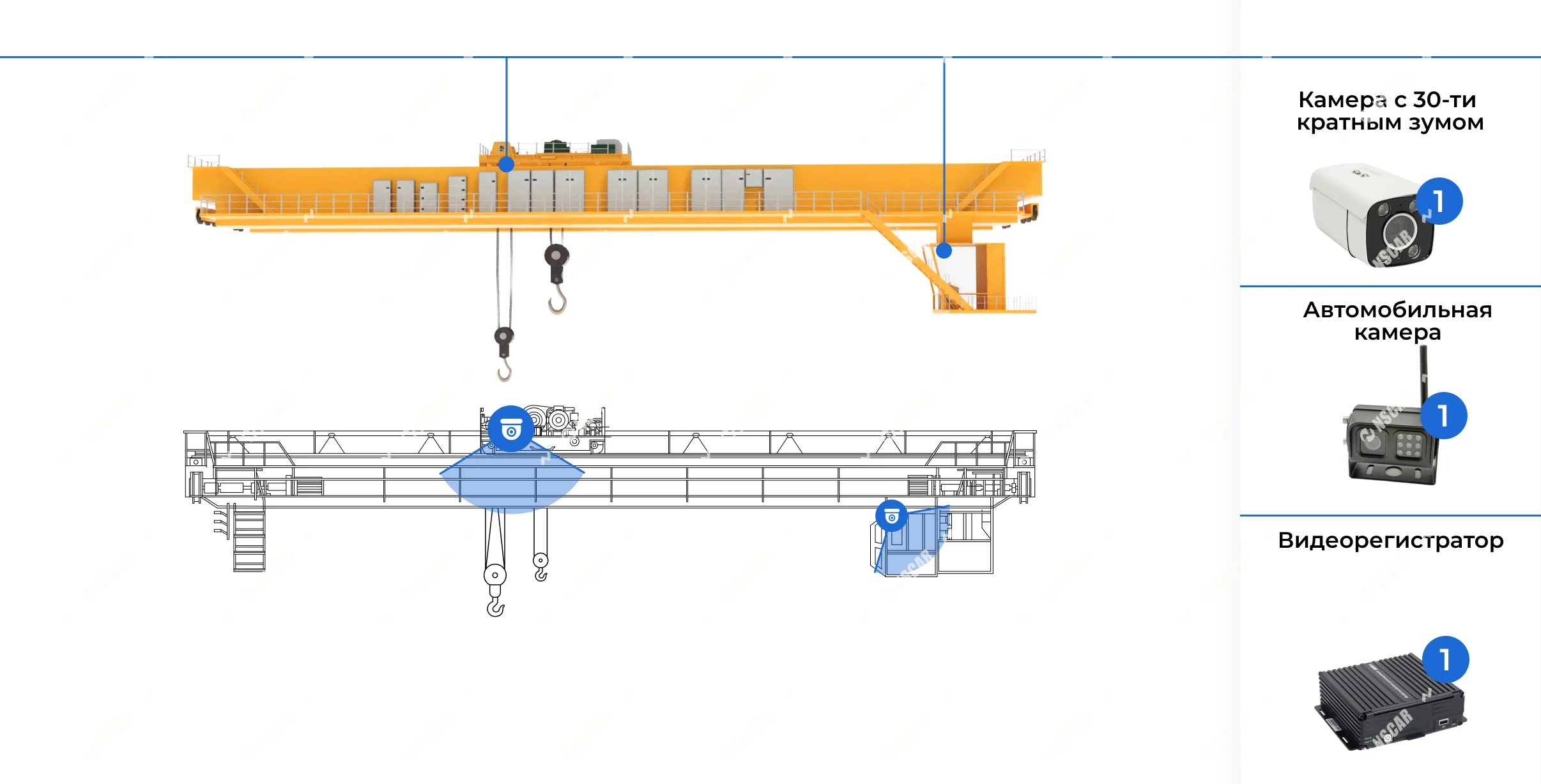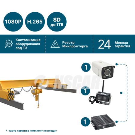 Комплект видеонаблюдения NSCAR для мостового крана предназначен для круглосуточного и онлайн-контроля работы подъёмного оборудования, зоны перемещения груза и ключевых технологических процессов. Система позволяет наблюдать за работой крана в режиме реального времени — как с рабочего места оператора, так и удалённо, через цифровые платформы мониторинга.