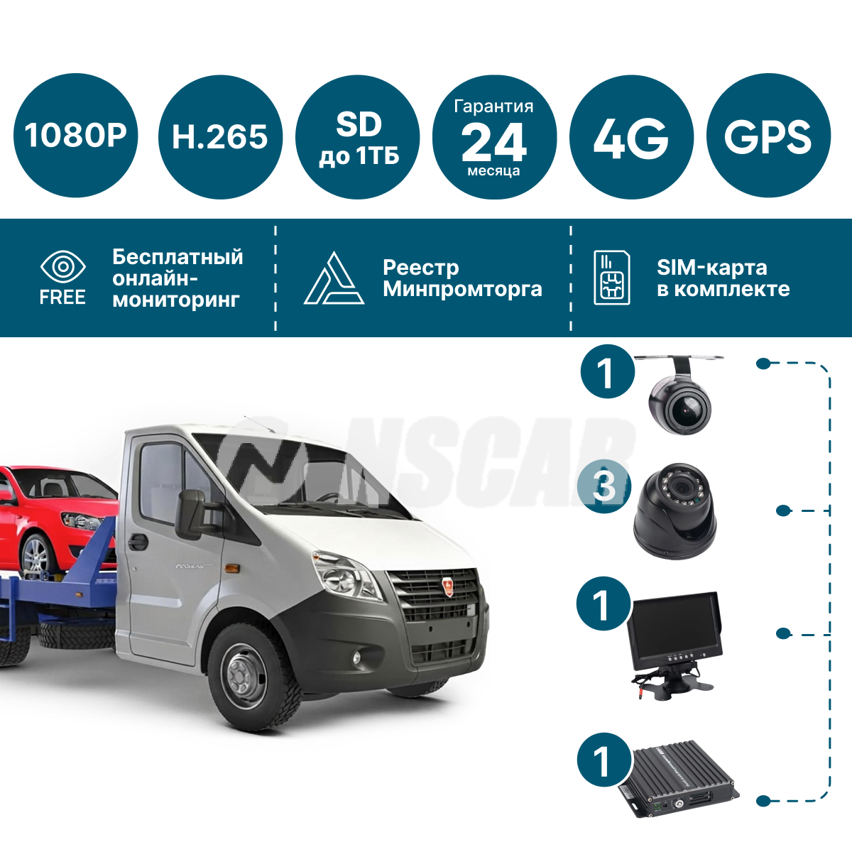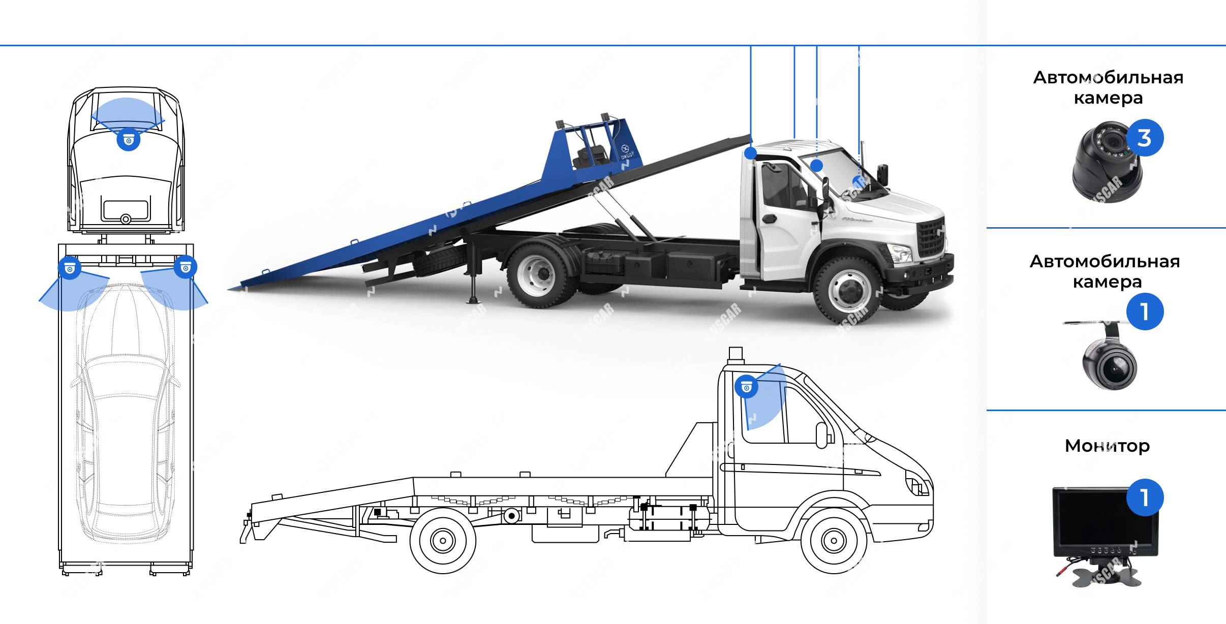 Комплект видеонаблюдения NSCAR ST49_SD предназначен для установки на эвакуаторы и спецтехнику, выполняющую погрузку, фиксацию и перевозку автомобилей. Система обеспечивает полный визуальный контроль всех ключевых зон во время движения, погрузки и транспортировки. Данный комплект подойдёт для служб эвакуации автомобилей, частных и корпоративных эвакуаторов, автопарков и сервисных компаний, а также страховых и лизинговых организаций и предприятий, оказывающих услуги платной эвакуации и транспортировки транспортных средств.