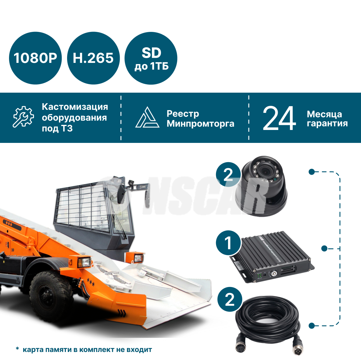 Комплект видеонаблюдения NSCAR ST2_SD Full HD предназначен для установки на коммунальную технику, снегопогрузчики, уборочные машины и другую специализированную технику. Запись ведётся в Full HD-качестве, видео сохраняется на SD-карту памяти до 1 ТБ.