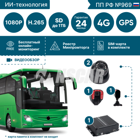 Комплект видеонаблюдения для общественного транспорта с системой помощи и контроля водителя ADAS-DSM. Подходит для установки на автобусы, маршрутные такси, троллейбусы, трамваи.