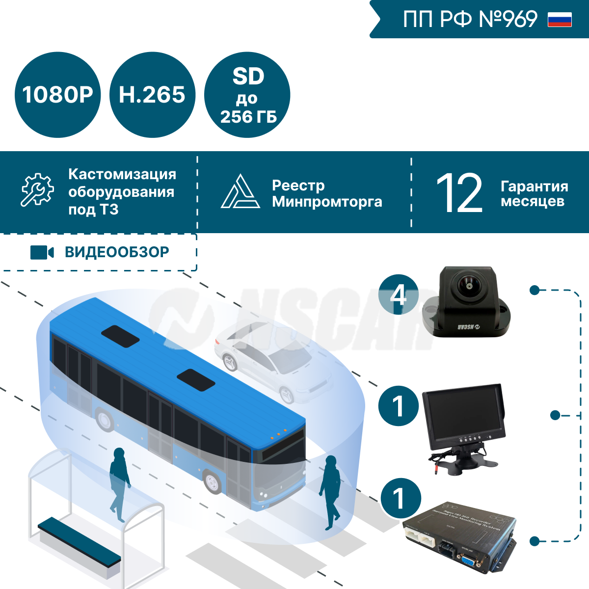 Стандартные комплекты NSCAR 360° рассчитаны на установку на транспорт длиной до 12 метров — этого достаточно для большинства автобусов, грузовиков и спецтехники.