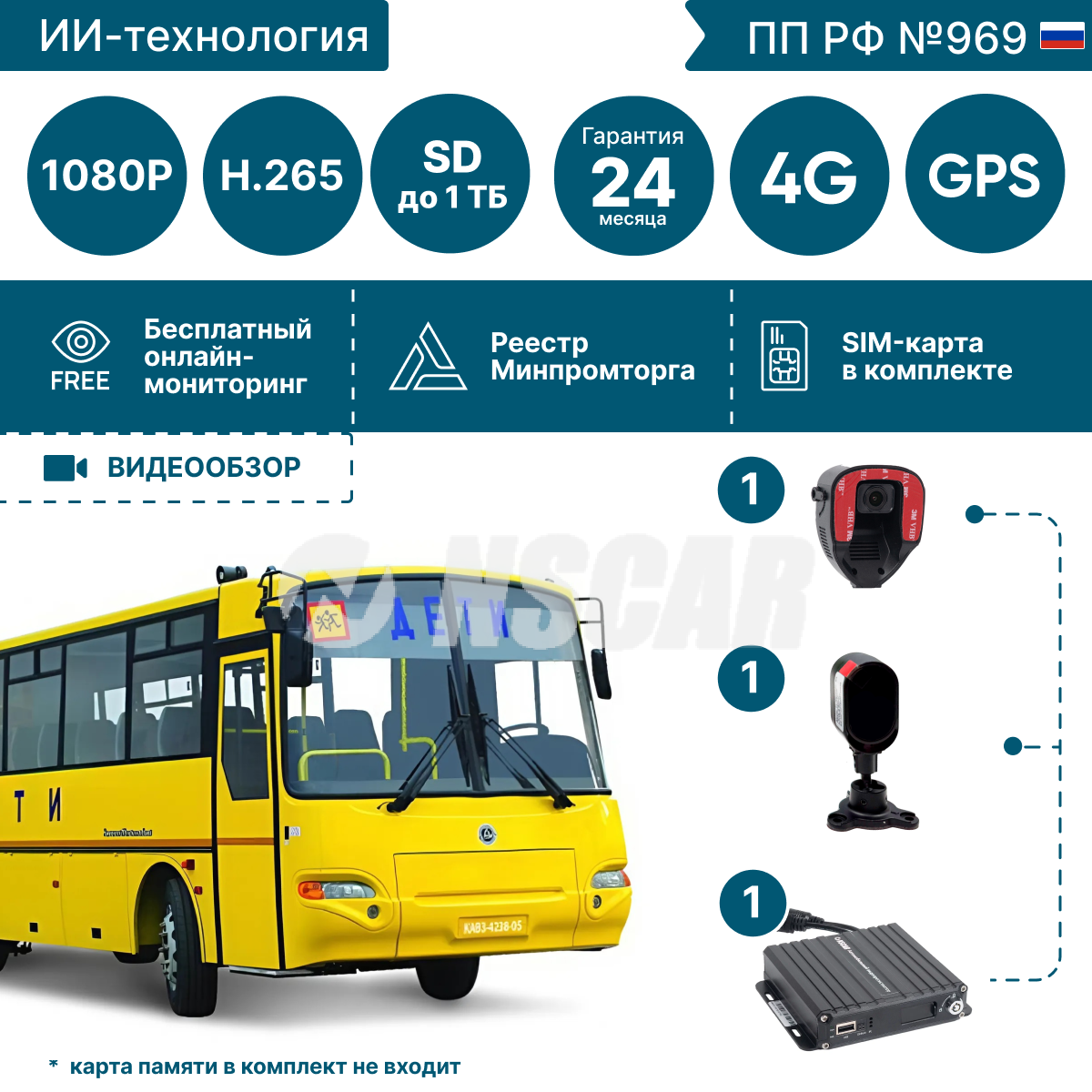 В составе комплекта используется видеорегистратор NSCAR F864 ver.06 SD 4G+GPS/ГЛОНАСС+Wi-Fi+ADAS DSM, обеспечивающий интеллектуальный контроль дорожной обстановки и поведения водителя. Регистратор поддерживает подключение до 4 аналоговых камер, а также возможность подключения одной IP-камеры (приобретается отдельно).