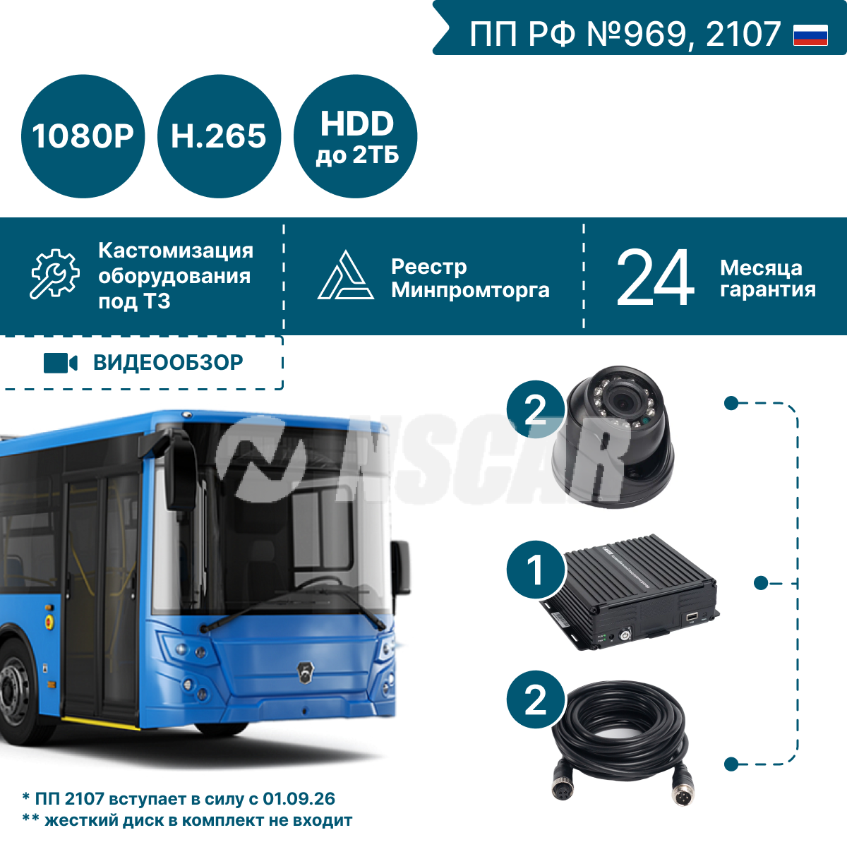 Комплект на 2 камеры NSCAR BUS201 FullHD_HDD (по 969) подходит для установки на автобусы, маршрутные такси, троллейбусы, трамваи, пассажирские поезда, метро, электрички, паромы, теплоходы, речные трамвайчики, самолеты.