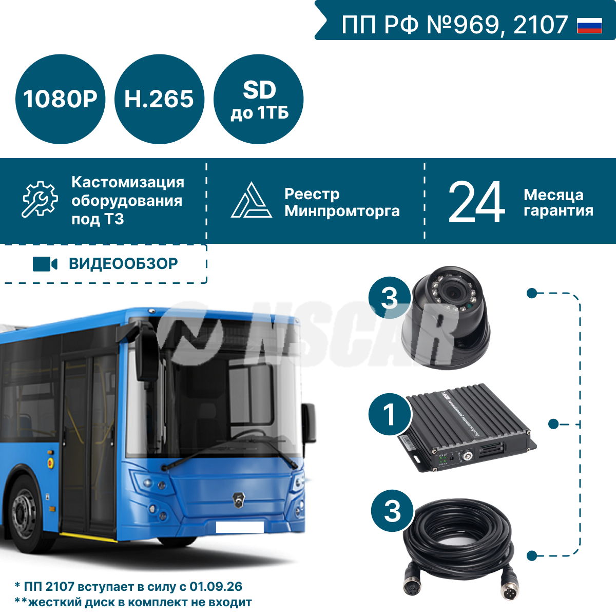 Комплект на 3 камеры NSCAR BUS301 FullHD_2SD (по 969) подходит для установки на автобусы, маршрутные такси, троллейбусы, трамваи, пассажирские поезда, метро, электрички, паромы, теплоходы, речные трамвайчики, самолеты.