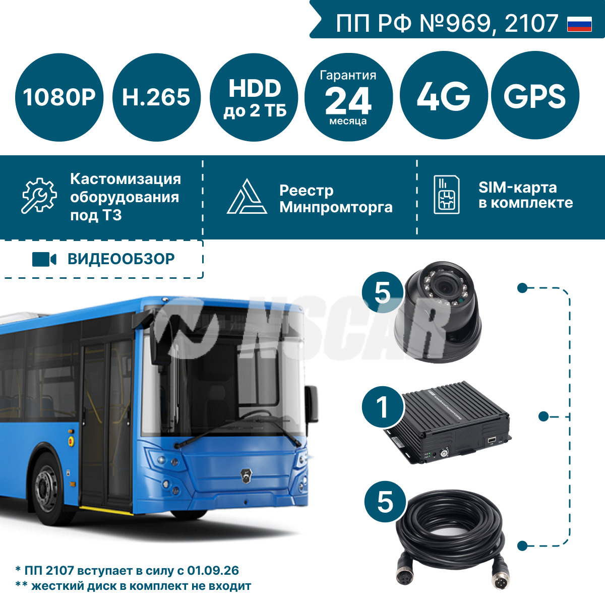 Комплект на 5 камер NSCAR BUS501 FullHD_HDD (по 969) подходит для установки на автобусы, маршрутные такси, троллейбусы, трамваи, пассажирские поезда, метро, электрички, паромы, теплоходы, речные трамвайчики, самолеты.