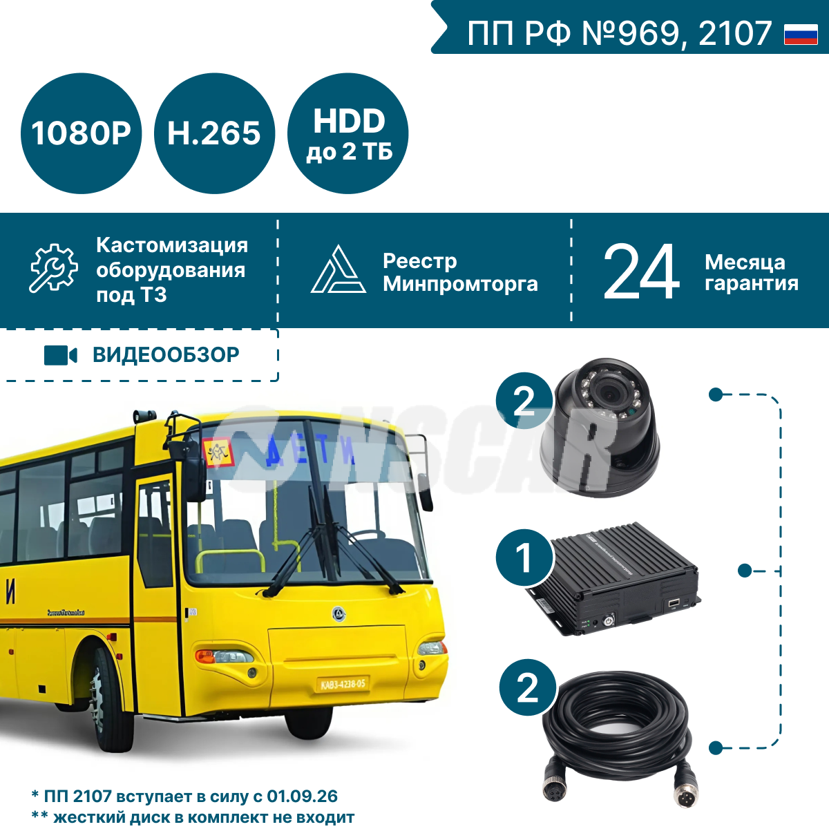 Комплект видеонаблюдения для школьного автобуса NSCAR – это надежное решение, соответствующее требованиям Постановления Правительства №969. Комплект включает 2 камеры высокого разрешения, которые обеспечивают контроль за обстановкой внутри салона и за водителем.
