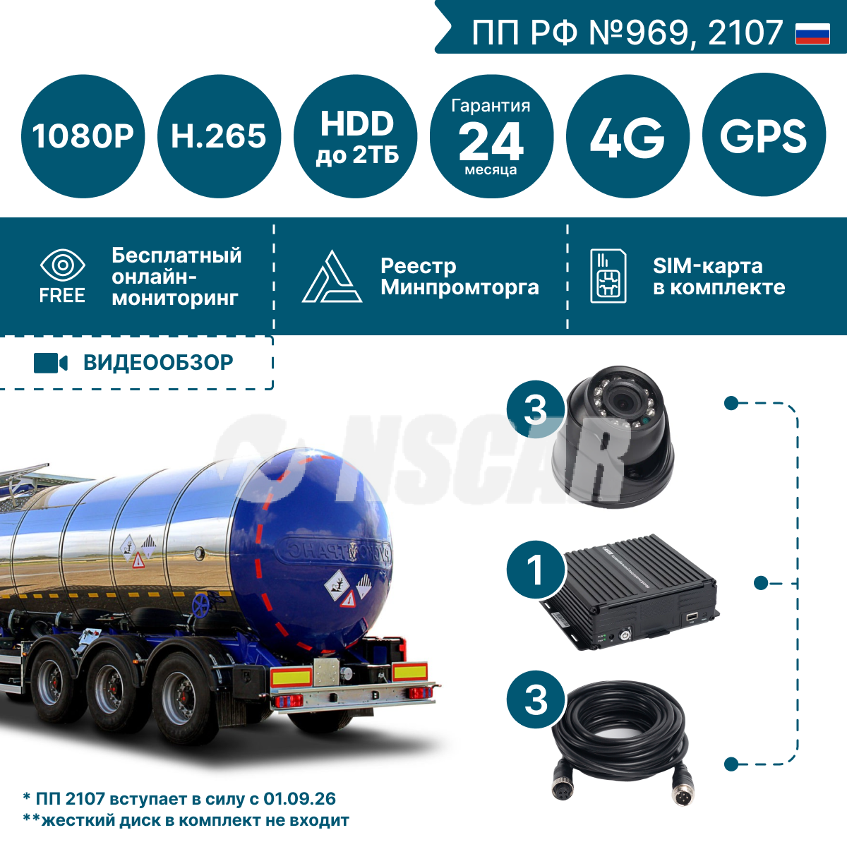 Комплект на 3 камеры NSCAR BN301 FullHD_HDD (по 969) подходит для установки на бензовозы, топливозаправщики, химические автоцистерны, танк-контейнеры, железнодорожные цистерны, битумовозы, бортовые автомобили, тентованные автомобили, изотермические автомобили (фургоны, рефрижераторы, прицепы)