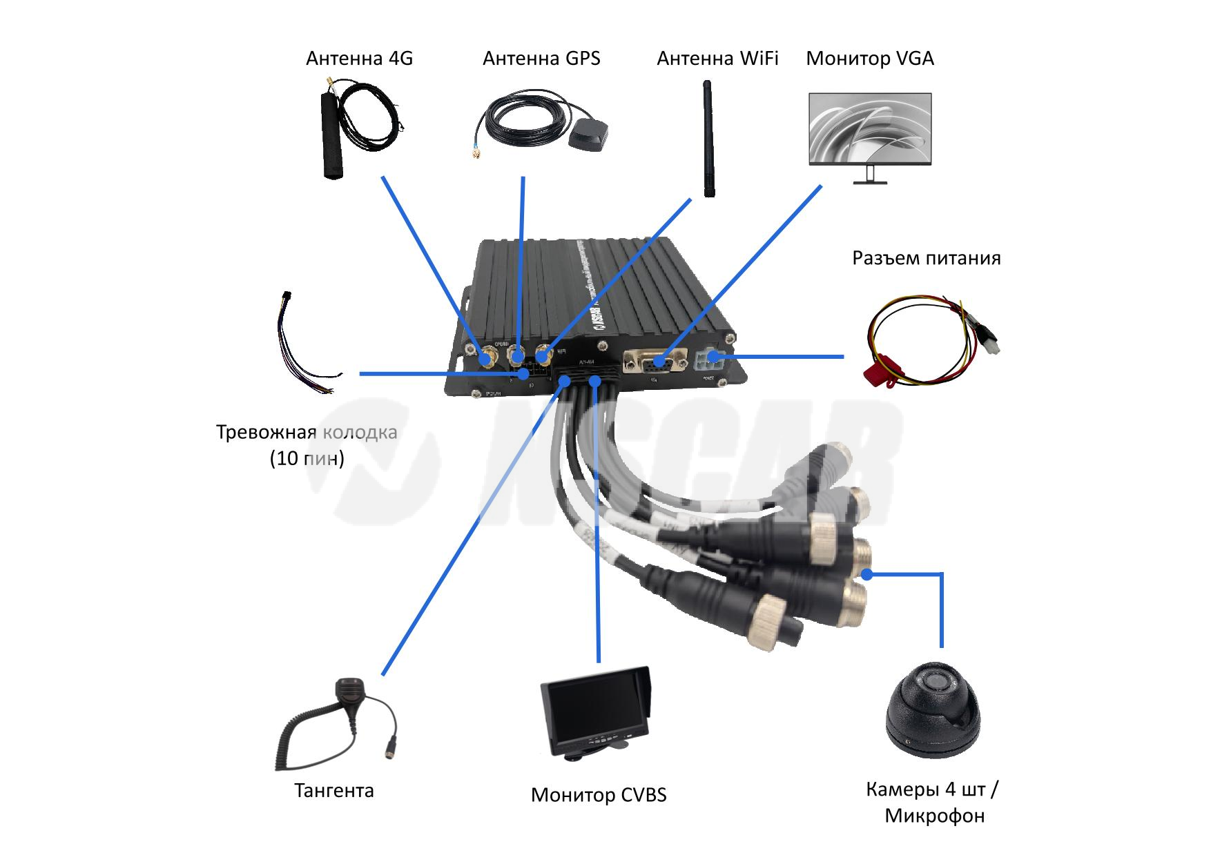 Автомобильный видеорегистратор NSCAR 401 SD 4G GPS WiFi поддерживает подключение 4х аналоговых камер максимальным разрешением 1280х720, запись ведется на карту памяти SD, так же видеорегистратор имеет дополнительные функции 4G, GPS, WiFi.